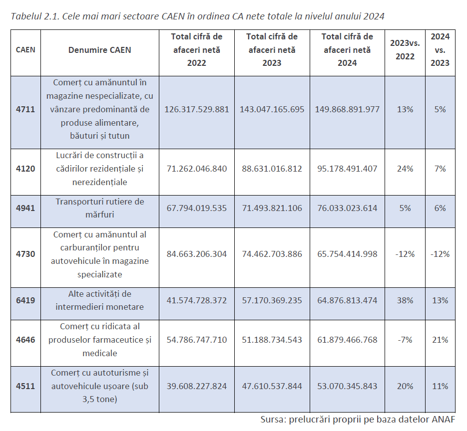 În top zece s-au menținut aceleași sectoare la nivelul anului trecut, chiar dacă ordinea a variat puțin, cu o excepție notabilă, CAEN 4621 „Comerț cu ridicata al cerealelor, semințelor, furajelor şi tutunului neprelucrat”. Acesta a coborât de pe poziția 5 în 2023 pe poziția 15 în 2024, după o scădere de 26% a cifrei de afaceri cumulate.