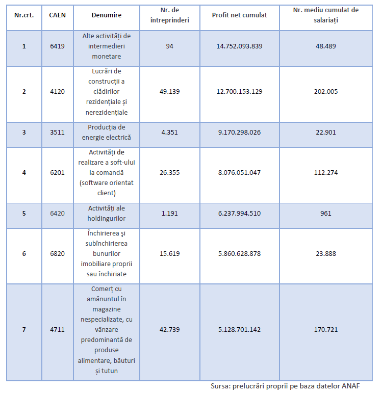 Comparativ cu anul precedent, sectorul CAEN 3511 ”Producția de energie electrică” a ajuns de pe prima poziție, la nivelul anului 2023, pe poziția 3 în anul 2024, iar sectorul CAEN 6201 (IT) a menținut locul 4 în acest clasament.
