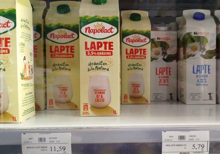 - lapte brand românesc (același producător) – 9 lei/litru