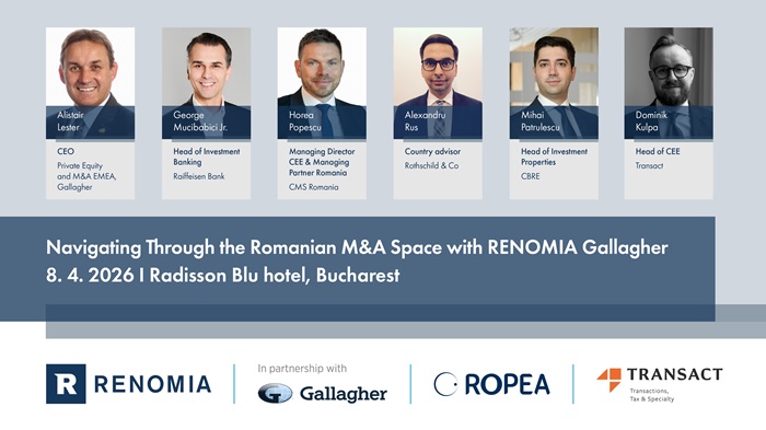 Renomia Gallagher, cu sprijinul BusinessMark, anunță organizarea evenimentului „Navigating Through the Romanian M&A Space with Renomia Gallagher”, ce va avea loc pe data de 8 aprilie 2026, începând cu ora 17:00, la Hotel Radisson Blu, București.