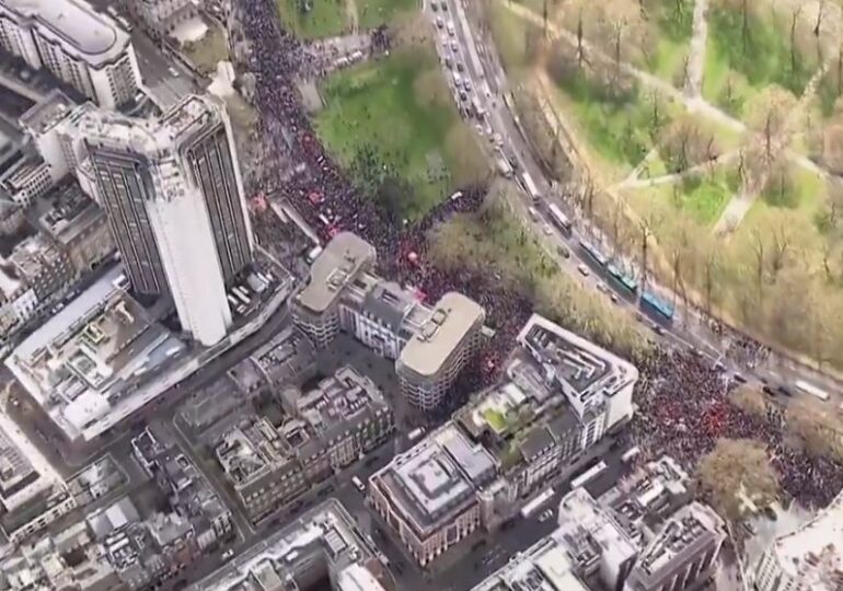 În Whitehall a fost difuzat și un mesaj video al primarului Londrei, Sadiq Khan. În paralel, o altă manifestație, organizată de Palestine Coalition, s-a alăturat traseului Together Alliance înainte ca participanții să ajungă în Whitehall.