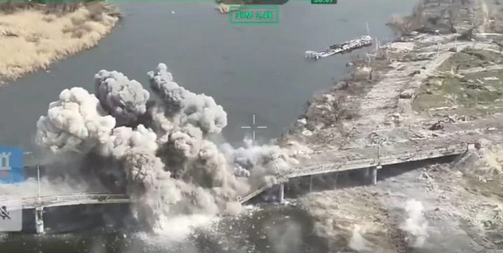 Forțele ucrainene au distrus un pod în partea ocupată de ruși a regiunii Herson, folosind drone produse în Marea Britanie. Este prima operațiune militară în care dronele au provocat distrugerea completă a unui pod.