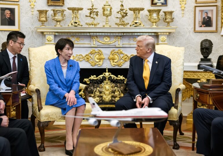 Ochii șefei guvernului nipon s-au mărit și aceasta și-a schimbat poziția pe scaun în timp ce Trump, care stătea alături de ea în Biroul Oval, a evocat momentul care a atras SUA în Al Doilea Război Mondial, relatează Reuters.