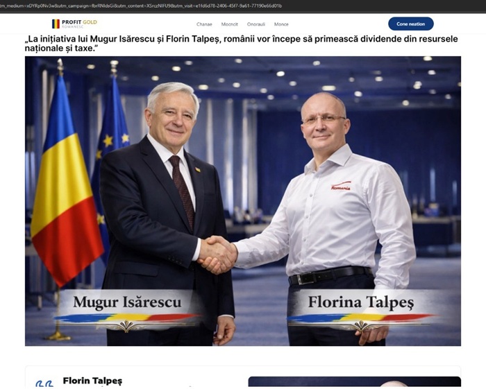 Videoclipul deepfake îi prezintă pe Mugur Isărescu și Florin Talpeș într-un cadru aparent oficial. Reclamele susțin că platforma face parte din programul național de dezvoltare digitală al României. Utilizatorii sunt redirecționați către un site care le cere date personale (nume, e-mail, telefon), le promite câștiguri de 4.000–6.000 lei pe zi și le solicită o depunere de 1.200–1.700 lei pentru a „activa algoritmul AI”.