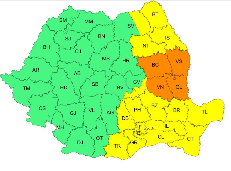 Mai gravă este situația din județele Vrancea, Galați, Vaslui și Bacău, aflate sub cod portocaliu de sâmbătă, ora 15:00, până duminică, la ora 10:00.