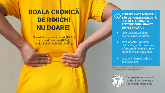 Prin campania „Boala cronică de rinichi nu doare”, Societatea Română de Nefrologie își propune: creșterea gradului de conștientizare asupra faptului că boala cronică de rinichi este frecventă și evoluează adesea fără simptome, educarea populației privind factorii de risc și importanța analizelor de screening, reducerea numărului de cazuri nediagnosticate și promovarea depistării precoce, care poate încetini evoluția bolii și reduce riscul de dializă și complicații cardiovasculare și nu în ultimul rând, normalizarea dialogului despre sănătatea rinichilor, în același mod în care populația discută deja despre tensiune arterială, colesterol sau glicemie.