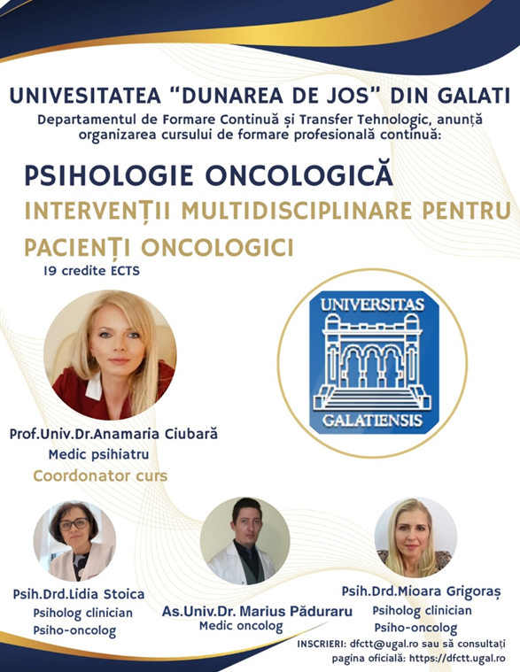 Începând cu ianuarie 2026, Universitatea Dunărea de Jos din Galați va lansa, prin Departamentul de Formare Continuă și Transfer Tehnologic, primul program universitar de formare profesională continuă dedicat psiho-oncologiei: „Psihologie oncologică – intervenții multidisciplinare pentru pacienți oncologici”.
