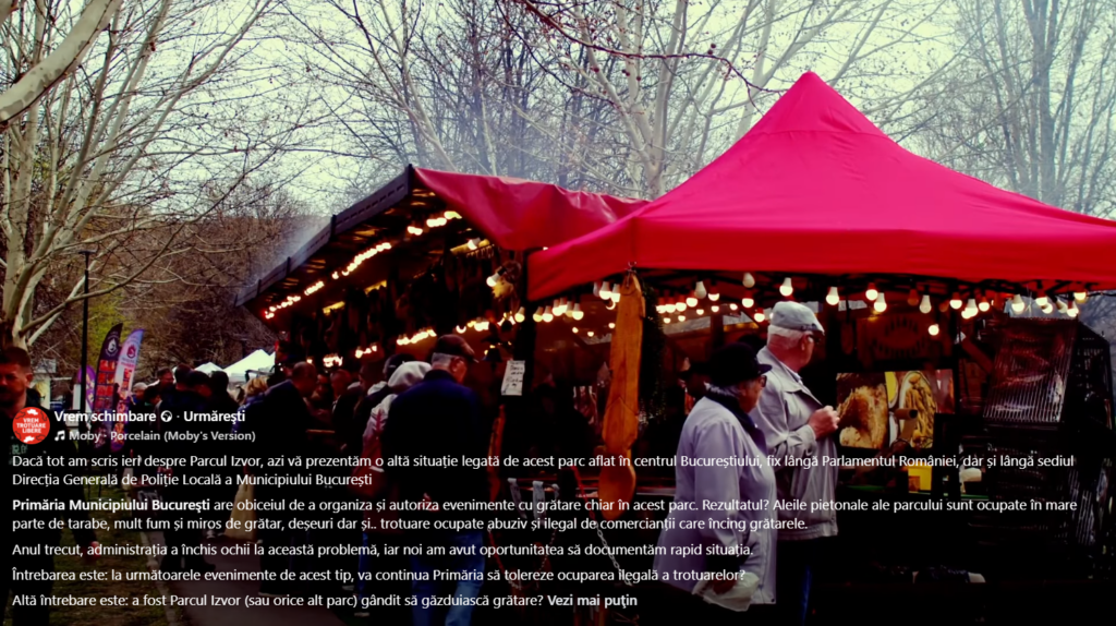 La începutul lunii octombrie, Comunitatea Vrem Schimbare a lansat un apel. Printre altele, comunitatea civică anunța că mașinile comercianților blochează trotuarele din jurul Parcului Izvor. Și ridica o întrebare: a fost creat oare acest parc pentru grătare?
