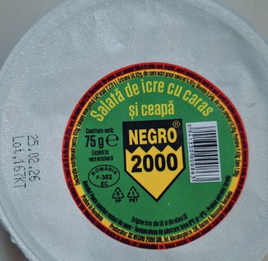 Potrivit Autorităţii Naţionale Sanitare Veterinare şi pentru Siguranţa Alimentelor, ”SC Negro 2000 SRL recheamă produsul Salată de icre cu caras şi ceapă 75 g, lot 167KT, cu data expirării 25.02.2026”.