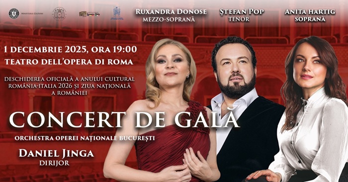 Ambasada României în Italia deschide seria evenimentelor incluse în programul Anului Cultural România–Italia 2026 printr-un Concert de Gală organizat în colaborare cu Opera Națională București și susținut de către Ministerul Afacerilor Externe și Ministerul Culturii din România, care marchează, totodată, și Ziua Națională a României.