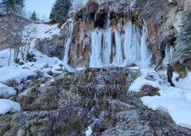 Imagini de basm în Munții Apuseni. Datorită gerului, de această dată Cascada de la Vidra s-a transformat într-un adevărat palat de cleștar. Căderea de apă de 18 metri este acum…